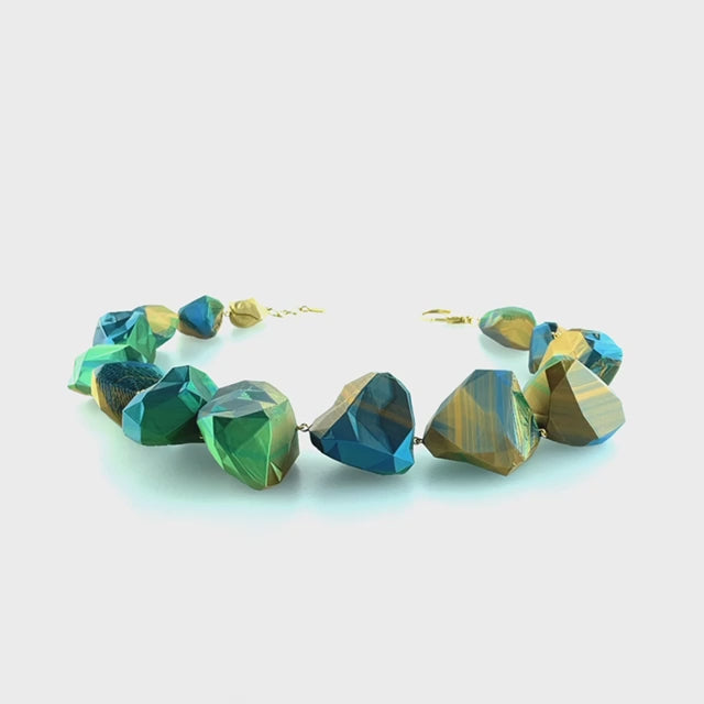 Opulentes Statement-Collier mit federleichten Schmucksteinen aus 3d gedrucktem Filament in grün- gold irisierendem Seidenmattfinish.