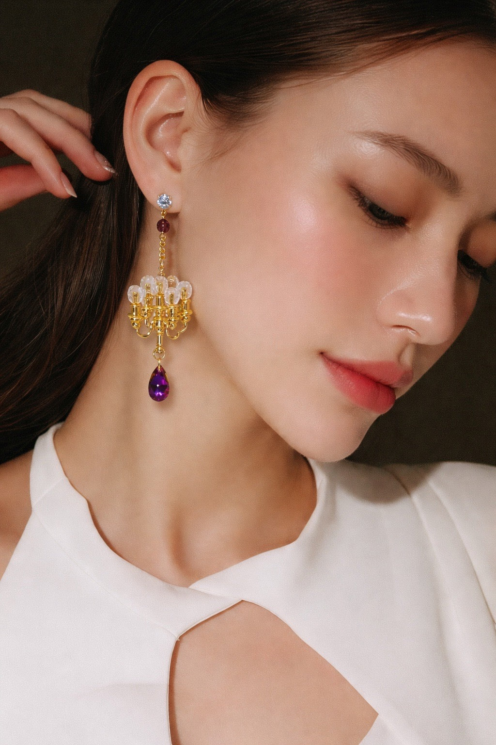 Die Ohrringe sind in zwei Farbvarianten erhältlich: einmal mit klassisch vergoldetem Korpus und pink-violettem Kristalltropfen, einmal in silberfarbenem Finish mit einem tiefblauen Stein. Beide Versionen bringen Licht ins Dunkel – ob zu festlichen Outfits oder als glänzendes Statement im Alltag.