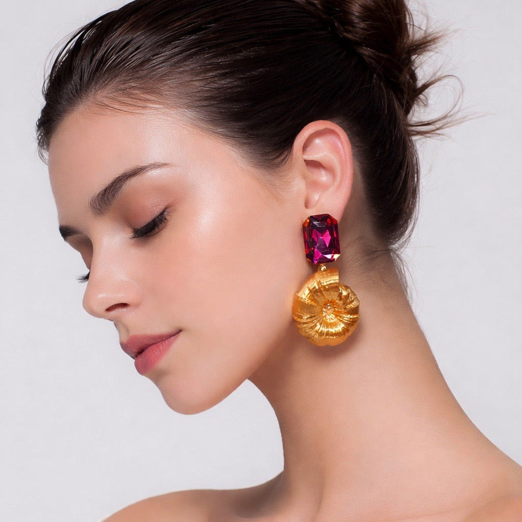 Goldenes Ammoniten Spektakel. 3D-gedruckte, goldene Ammoniten treffen auf fette, rubin rote Strasssteine – befestigt an echten 925er Silbersteckern, versteht sich. Leicht, laut, spacig. Handmade von TUKADU in Berlin.