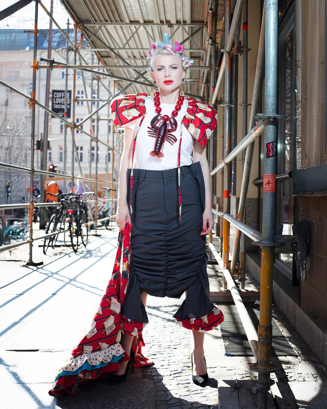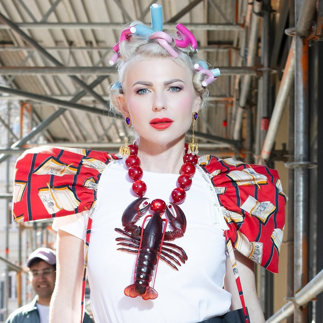 A huge lobster embellished with rhinestones forms the centerpiece of this necklace made of different shades of red Polaris beads.