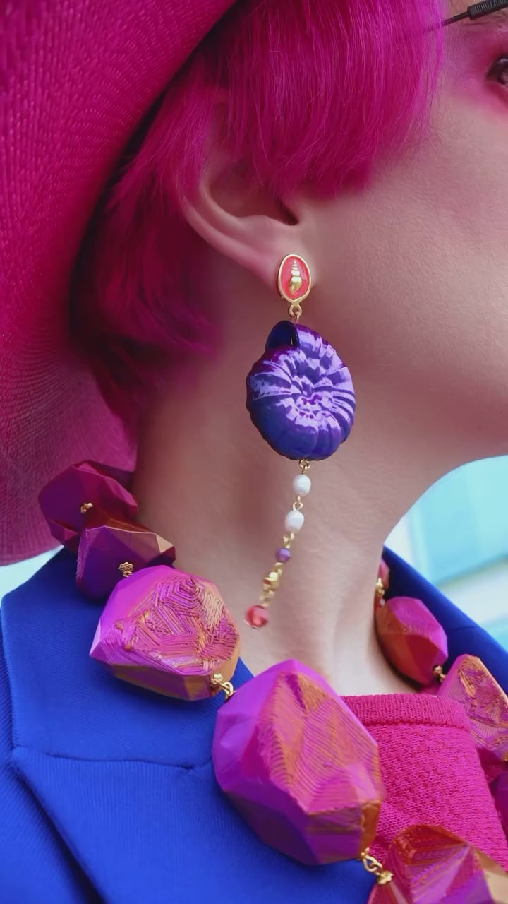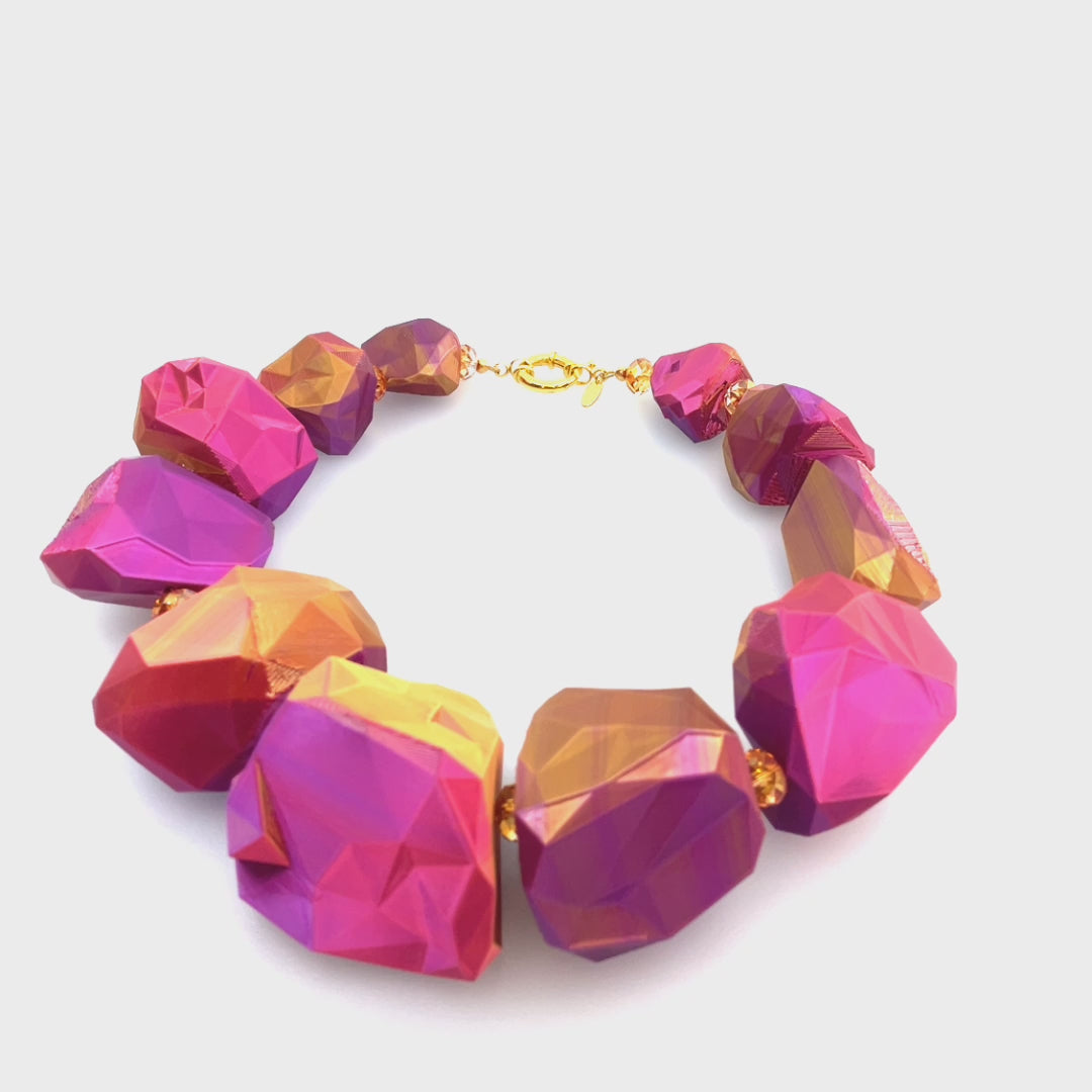 Opulentes Statement-Collier mit federleichten Schmucksteinen aus 3d gedrucktem Filament in pink-orange irisierendem Seidenmattfinish.