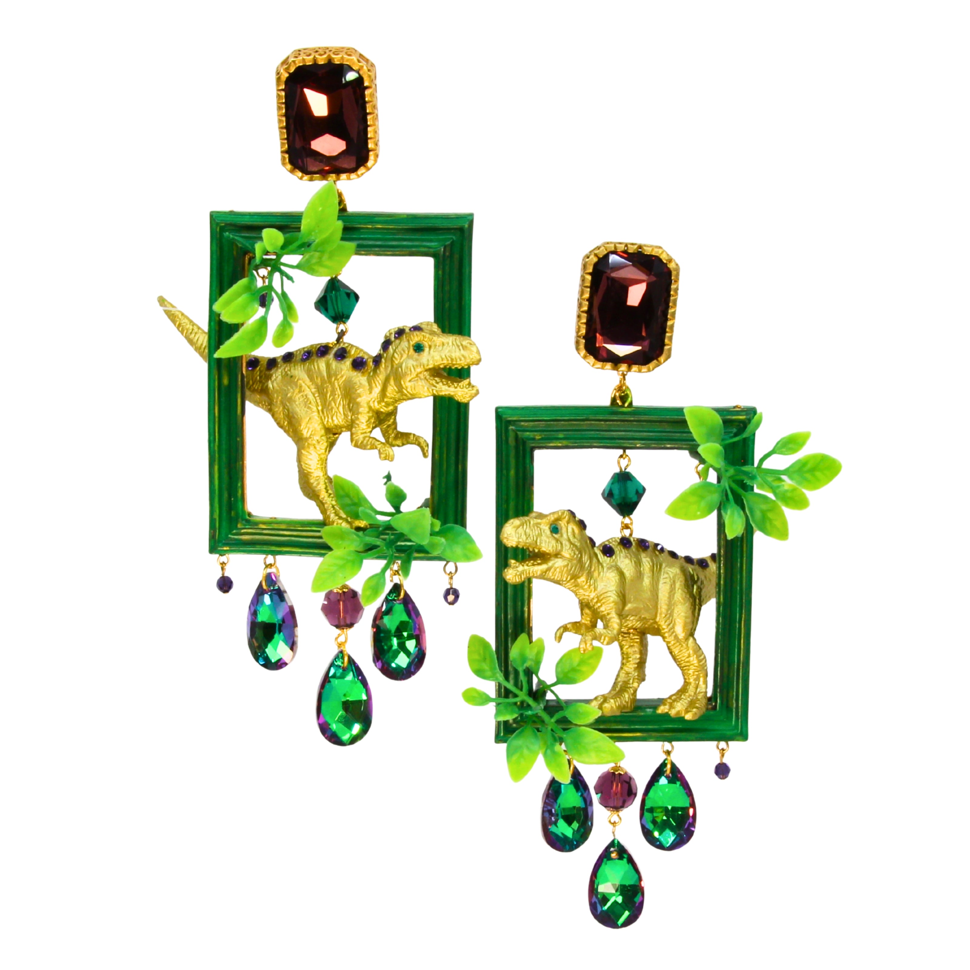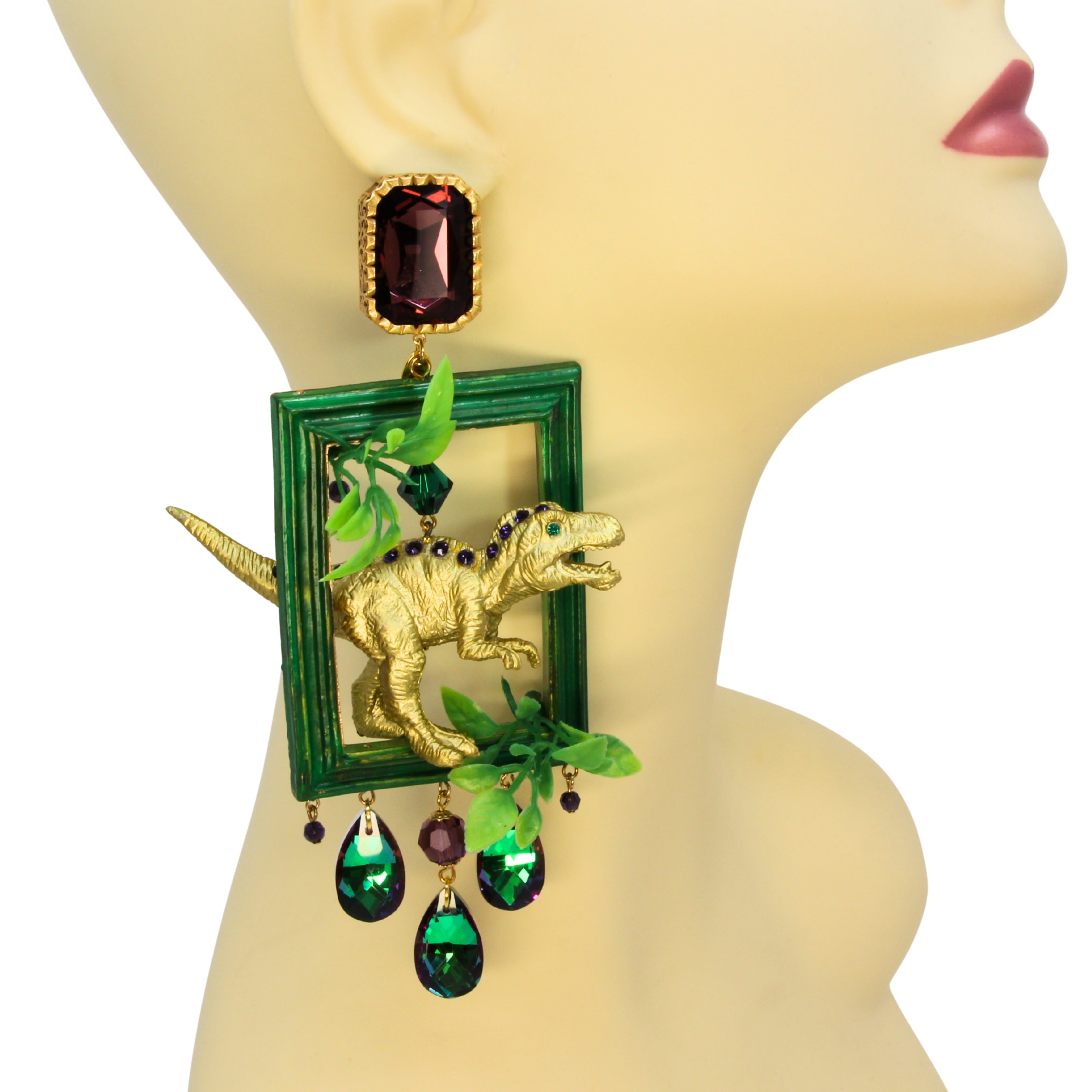 Ein Hauch Urzeit im Zauberwald: Die Dino Diorama Ohrclips sind funkelnde Mini-Szenen, in denen goldene Dinosaurier durch smaragdgrüne Bilderrahmen treten – umrankt von zarten Blättern und glitzernden Tropfen in Grün und Purpur.