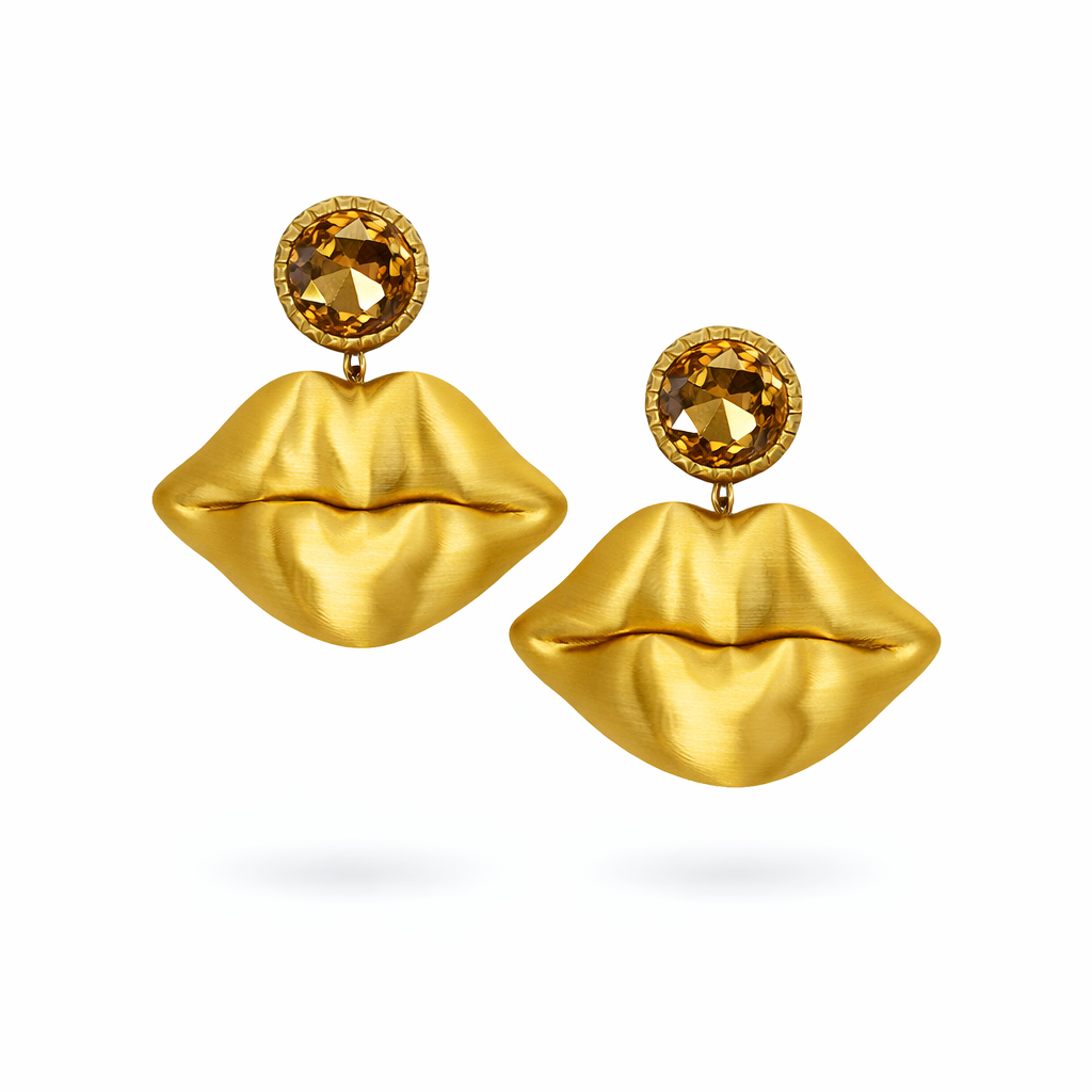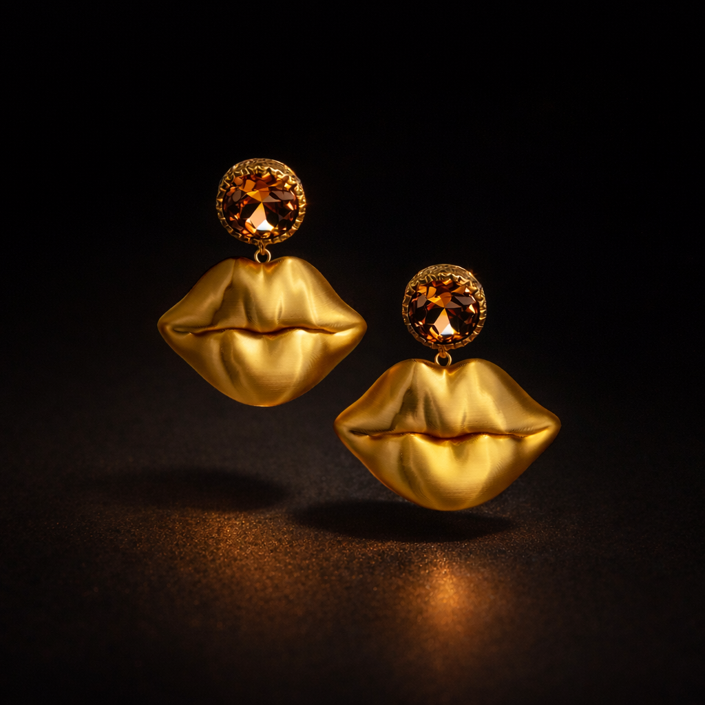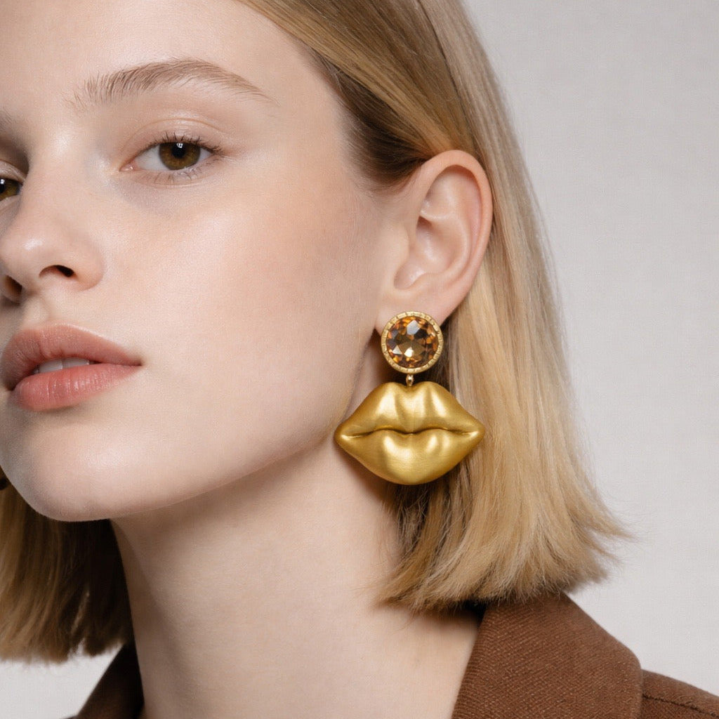 Diese ausdrucksstarken Statement-Ohrringe kombinieren 3D-gedruckte Kussmünder mit einem funkelnden Strass-Ohrstecker in warmem Rot-Gold-Ton. Der plastisch modellierte Lippenanhänger mit satinierter Oberfläche verleiht dem Design Tiefe und Charakter, während der facettierte Strassstein für einen eleganten Glamour-Akzent sorgt. Ein selbstbewusstes Schmuckstück mit ikonischer Form – verspielt, extravagant und absolut blickfangstark.