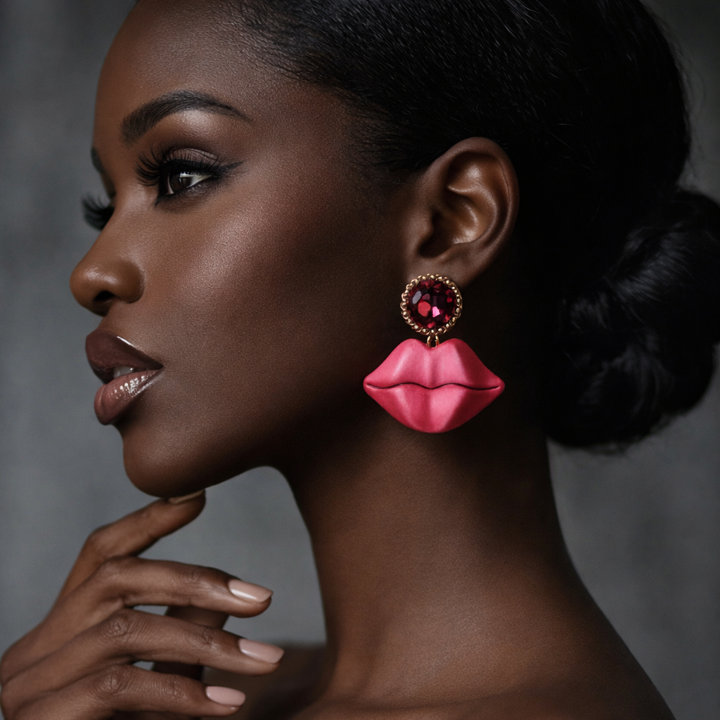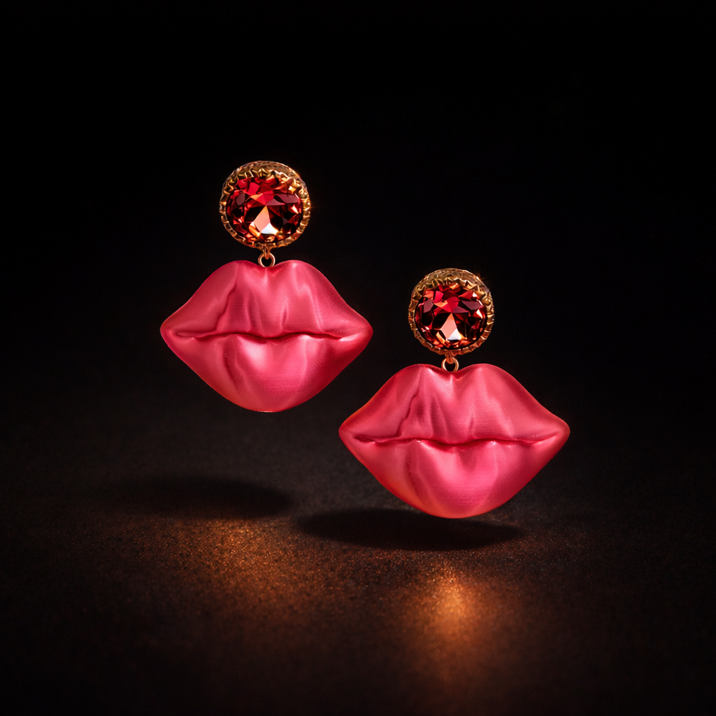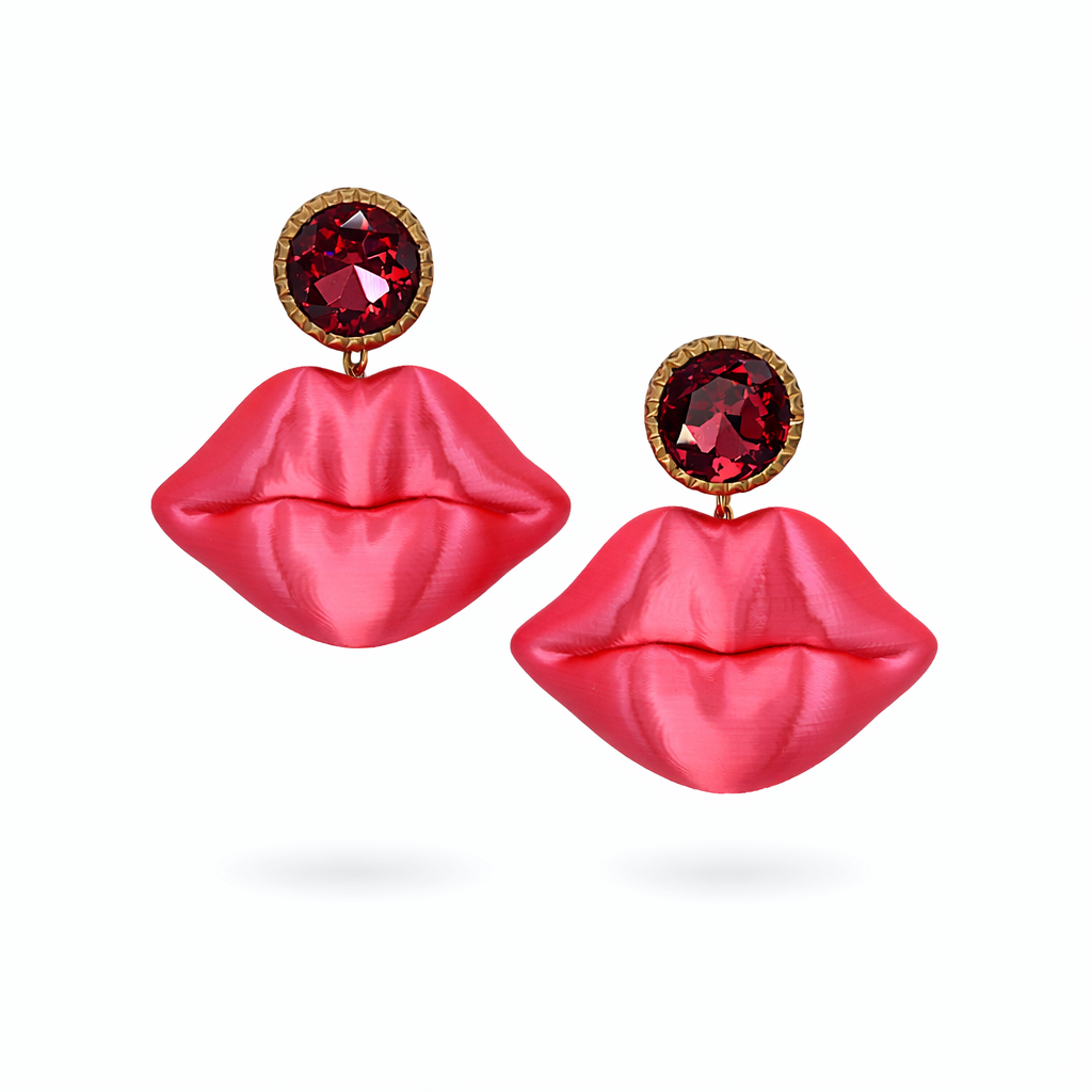 Diese ausdrucksstarken Statement-Ohrringe kombinieren 3D-gedruckte Kussmünder mit einem funkelnden Strass-Ohrstecker in aufregendem Pink-Ton. Der plastisch modellierte Lippenanhänger mit satinierter Oberfläche verleiht dem Design Tiefe und Charakter, während der facettierte Strassstein für einen eleganten Glamour-Akzent sorgt. Ein selbstbewusstes Schmuckstück mit ikonischer Form – verspielt, extravagant und absolut blickfangstark.
