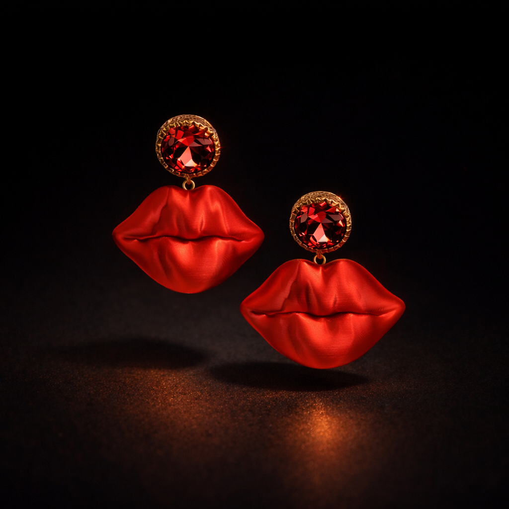 Diese ausdrucksstarken Statement-Ohrringe kombinieren 3D-gedruckte Kussmünder mit einem funkelnden Strass-Ohrstecker in warmem Rot-Gold-Ton. Der plastisch modellierte Lippenanhänger mit satinierter Oberfläche verleiht dem Design Tiefe und Charakter, während der facettierte Strassstein für einen eleganten Glamour-Akzent sorgt. Ein selbstbewusstes Schmuckstück mit ikonischer Form – verspielt, extravagant und absolut blickfangstark.