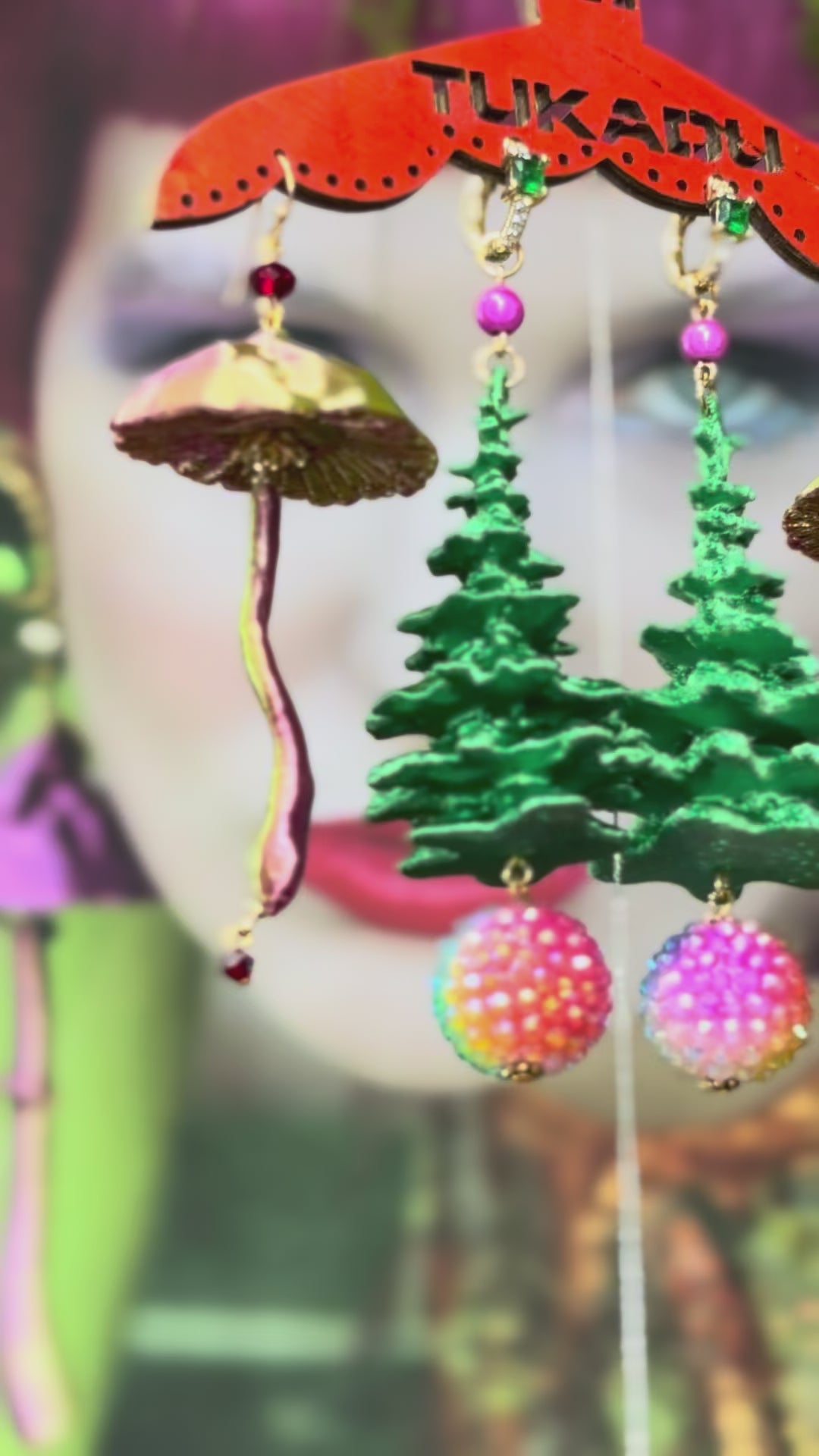 Regenbogentanne ist ein Fest in Bewegung – ein leuchtender Weihnachtsbaum, der nicht stillsteht, sondern tanzt. Der 3D-gedruckte Tannenbaum in frischem Grün trägt einen extravaganten Behang aus bunten Strassperlen, die bei jeder Bewegung glitzern wie Lichterketten im Rausch. Am Ohr schimmert ein pinkfarbener Glasstein und setzt den perfekten Kontrast zum tiefgrünen Baum und den goldenen Details. Die Ohrringe sind etwa neun Zentimeter lang und wiegen nur rund drei Gramm pro Seite – auffällig, aber federleicht. Jedes Paar wird im Tukadu Store in Berlin von Hand gefertigt und bringt Farbe, Witz und eine Portion Feiertagsfreude ins Spiel – für alle, die Weihnachten feiern, wie es ihnen gefällt.